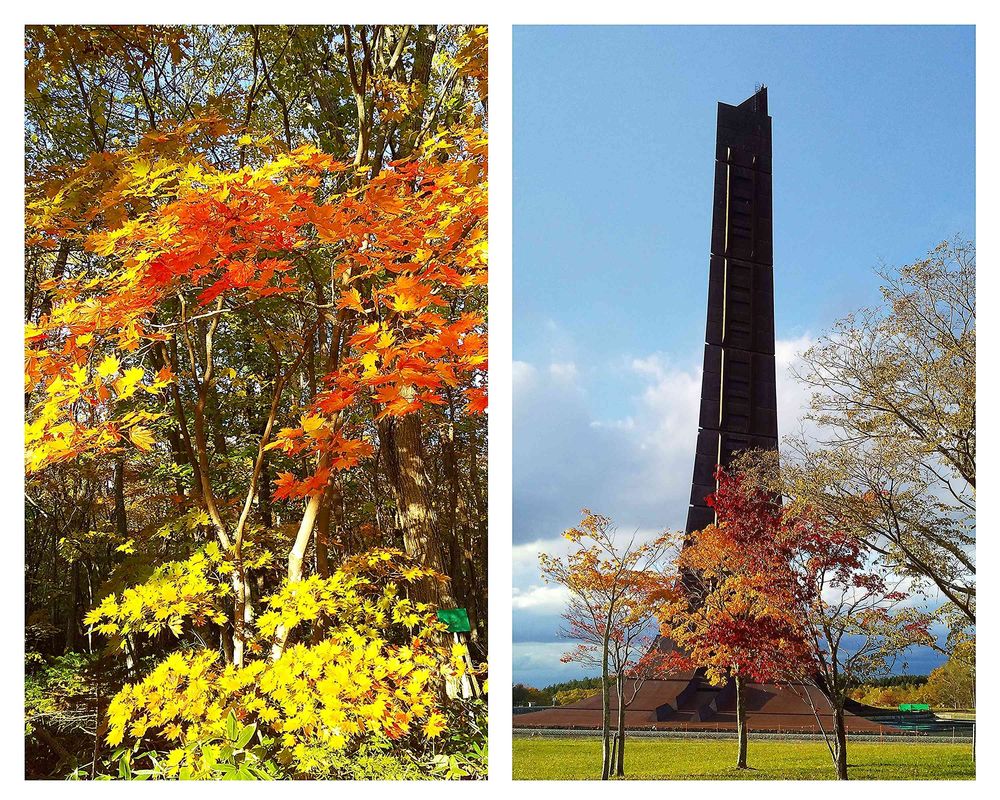 50年が経過して撤去予定の高さ100m「北海道開基100年記念塔」とカエデもみじ?
