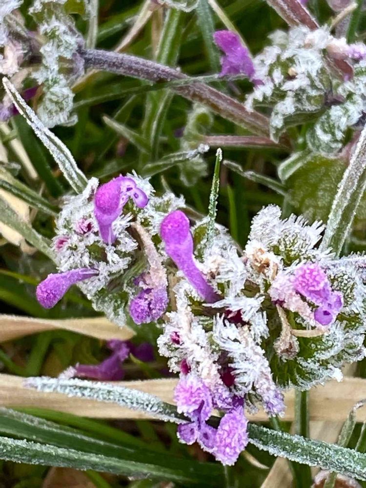 ホトケノザの紫色が霜の中で綺麗でした💜