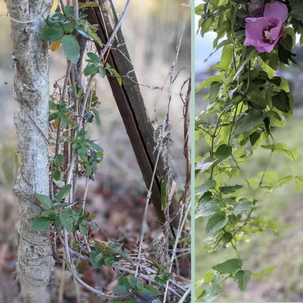 それからグングングングン、私の大好きな赤い木槿の枝を何本も絡め取り締め上げ、ハラハラする展開に。7月12日には右の写真の様になりました。お花の満開は8月末。いっその事素敵な綿毛を楽しみましょうと思いましたが、土手の方に垂れている為禄に写せず、残念な結末になりました。