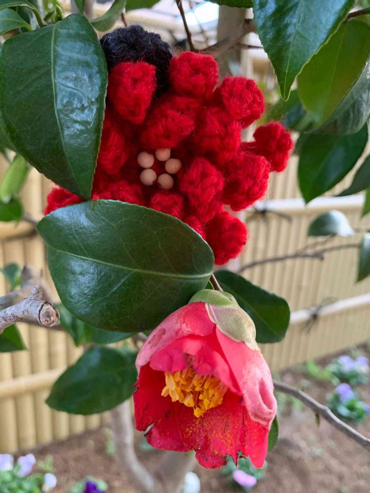 全くお花が付かない椿の木もあります💦お友達の作ってくれたモフモフの可愛い椿のブローチ❤でこんな寒い日も心が温かくなります🌼