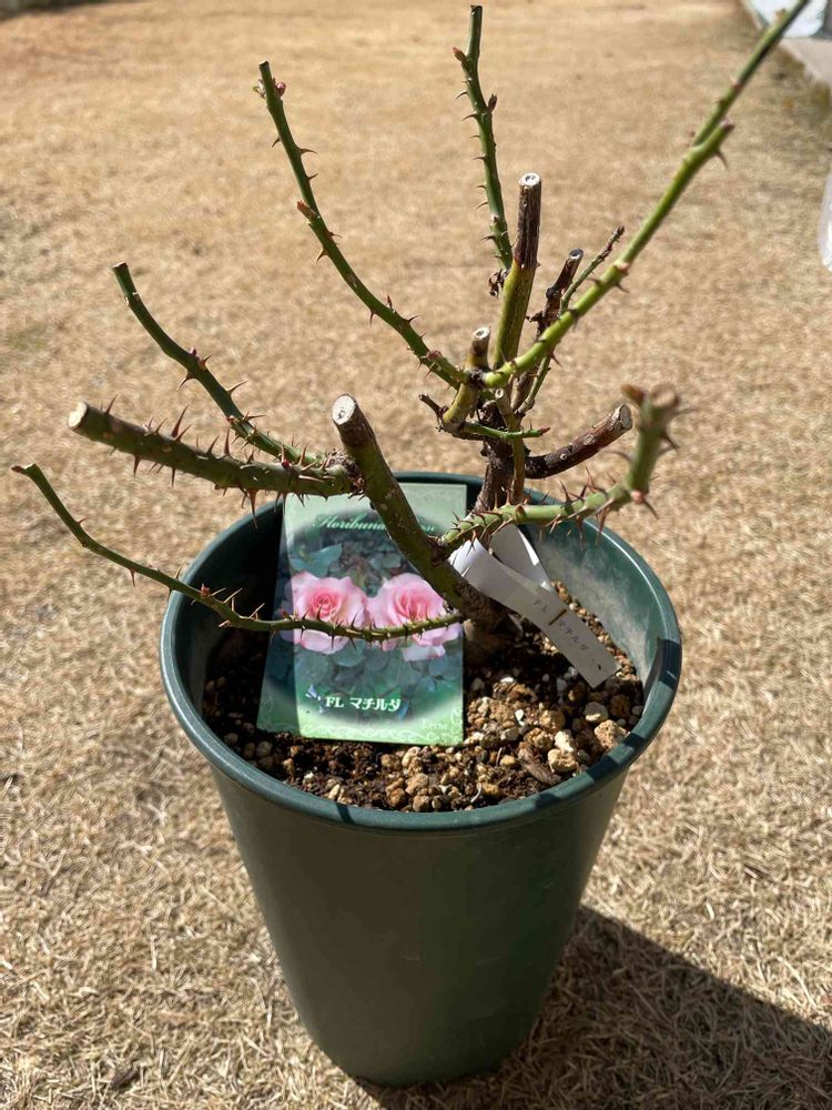 他のお花の苗を見ていたら👀薔薇の大苗が半額シール付き!税込1240円‼︎しかもとっても可愛いピンクの薔薇のタグ💕名前は「マチルダ」𓂃 𓈒𓏸𑁍