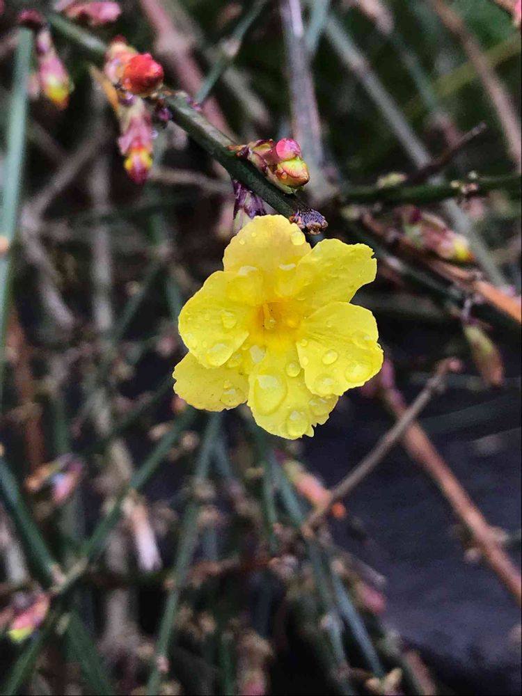 中国名は迎春花、英名はウィンタージャスミンと付いており、どちらも良い感じの名前です。出来れば天気の良い暖かい日にアップしたかったのですが、今日目に付いたのであげました。雨粒はアクセントです😭。