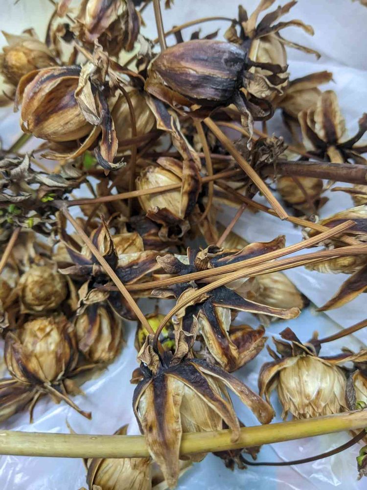 皇帝ダリアを、バッサリ切りました。根元より、2本!先端の花が、枯れて、種が付いていました。私も初めて種が出来るんだと知りました。切り戻しが、遅すぎました。この種で種まきに挑戦しょうかと考えてます。デモこんなに沢山は要らないかもね🤔😅🤣