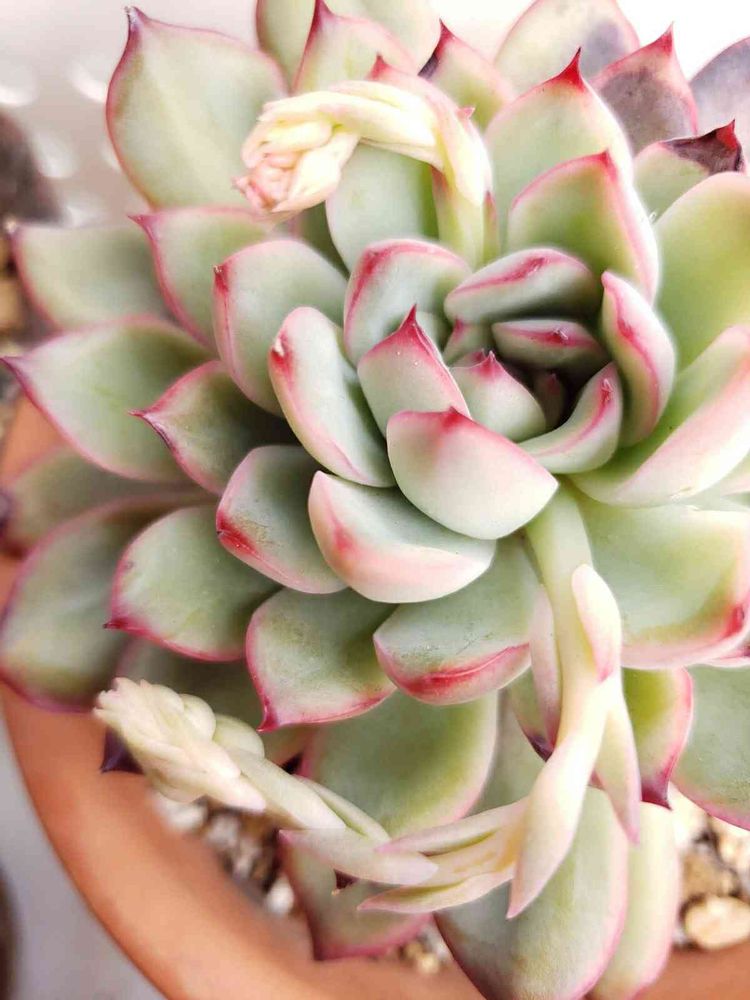外は雪混じりの空ですが、エケベリアの「春うらら」が花芽を2本上げています。