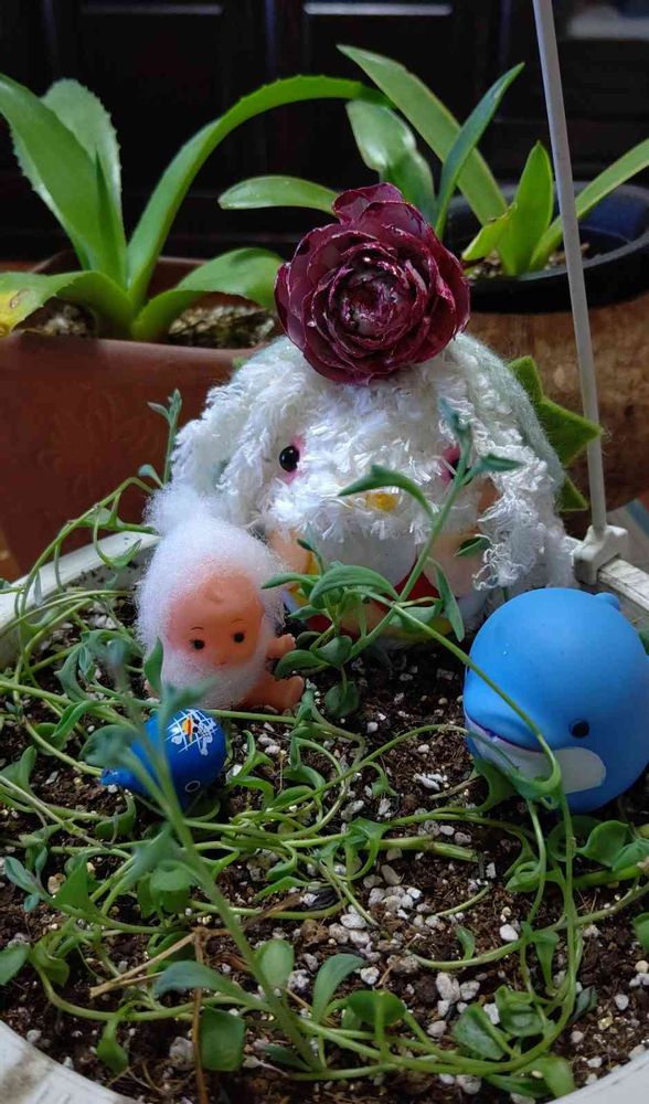 昨年の夏金魚になった🐬ちゃん。なんとか元気になってきたので、参加させて下さい。ニット頭のアマビエちゃんとモヘアのキュピちゃんも。