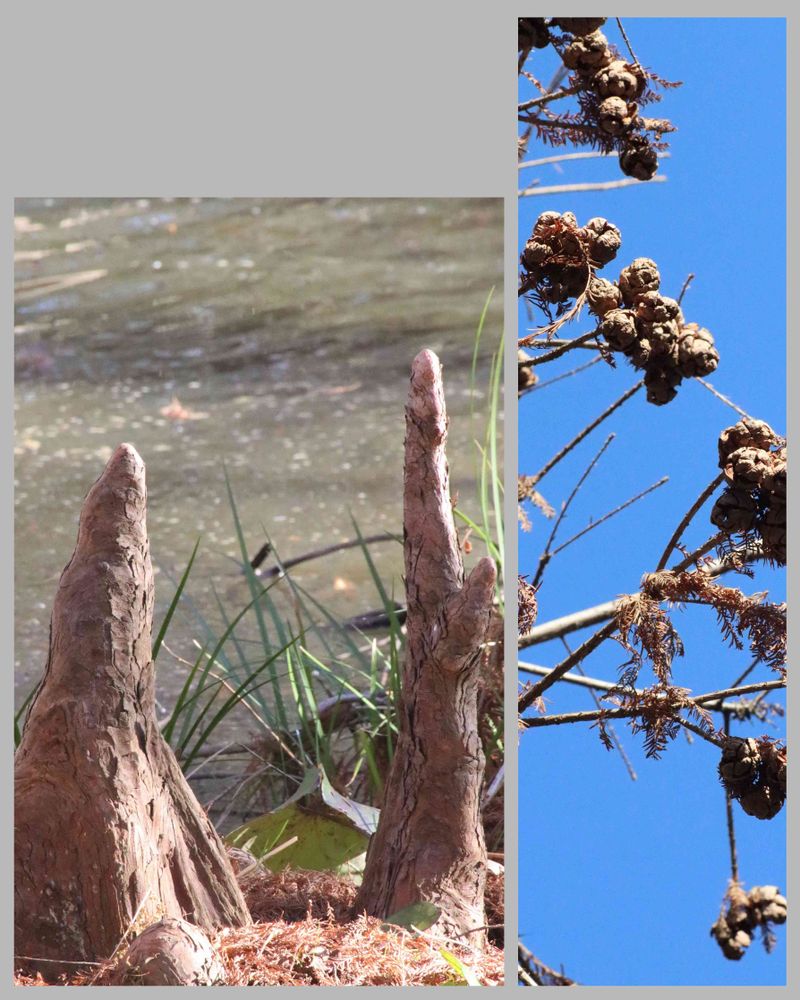 昨日ウォーキングを兼ねて出かけた公園で、ラクウショウの気根と実を見ました。池の周りに植えられているメタセコイアによく似た幹の近くに、地面から大きな呼吸根(気根)が何本も出ています。別名ヌマスギと呼ばれるとおり湿地や沼地を好み、その環境に適応している根のようです。枝先には実と葉がまだついていました。