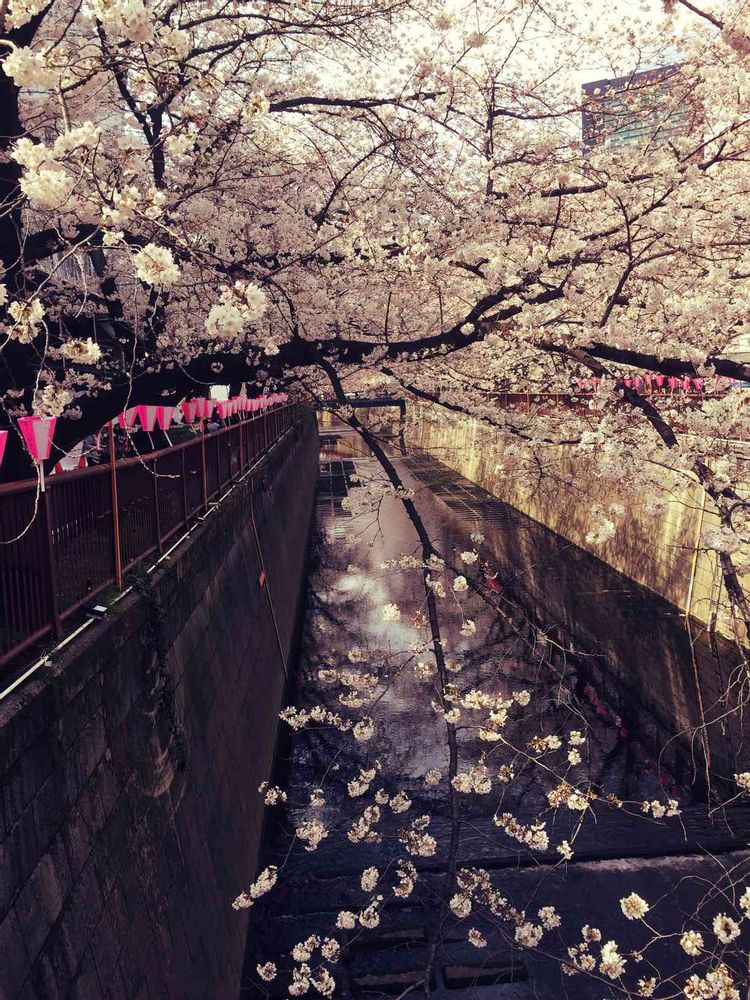 今日の目黒川の桜。すご人混み。桜、全体的に六、七分咲き🌸