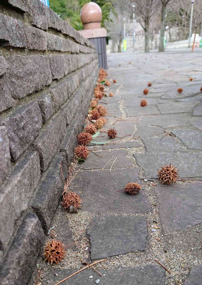 モミジバフウが紅葉の後 実が落ちて散乱しています❗ 季節を感じますね🤔