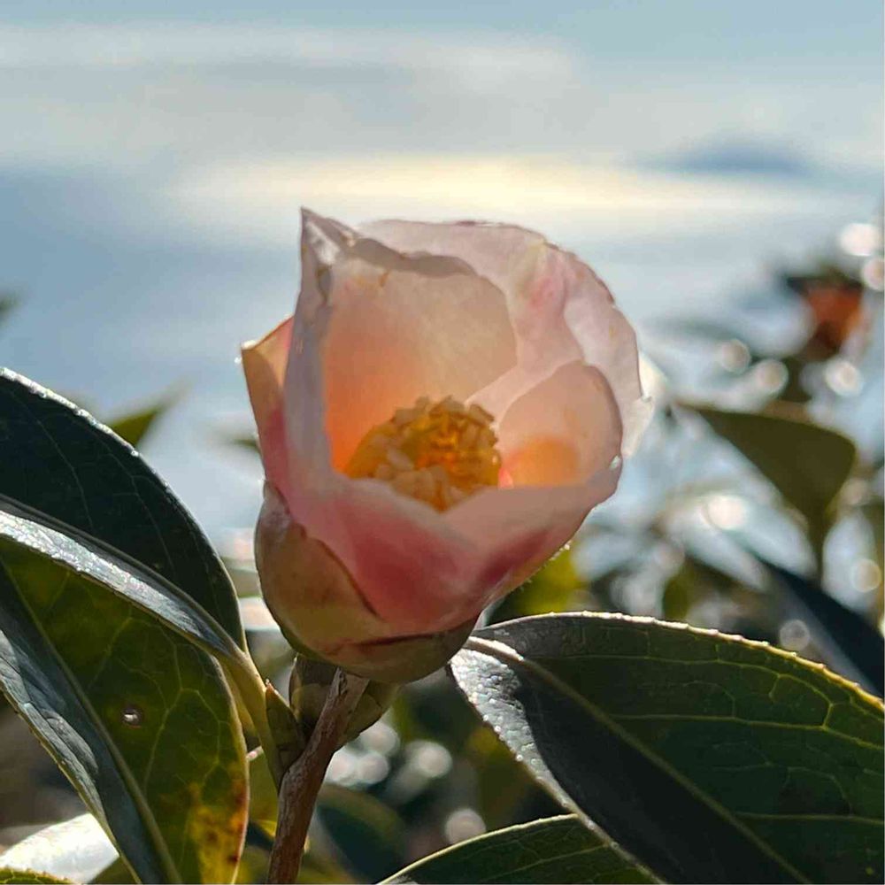 今朝の1枚は、万葉岬の椿園・瀬戸内海と椿 🌸