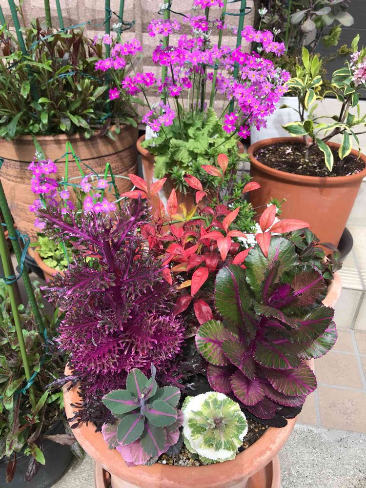 成長した葉牡丹、オタフク南天、サクラソウ
