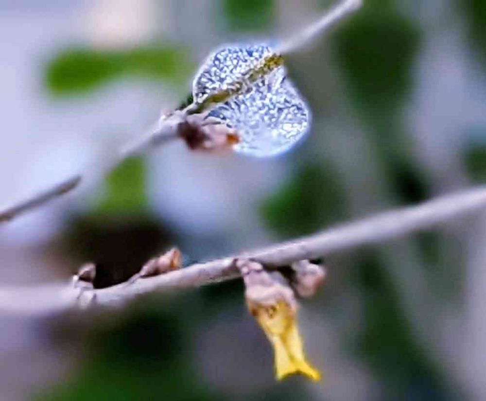 今朝、アプローチの蝋梅にもハート型の雪のお花がきれいに咲いていました。