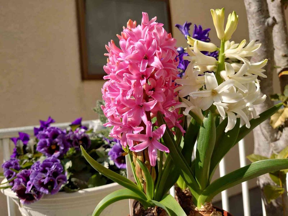ヒヤシンス、やっとこさ咲きました😃🎶💜🤍💗🌿✨