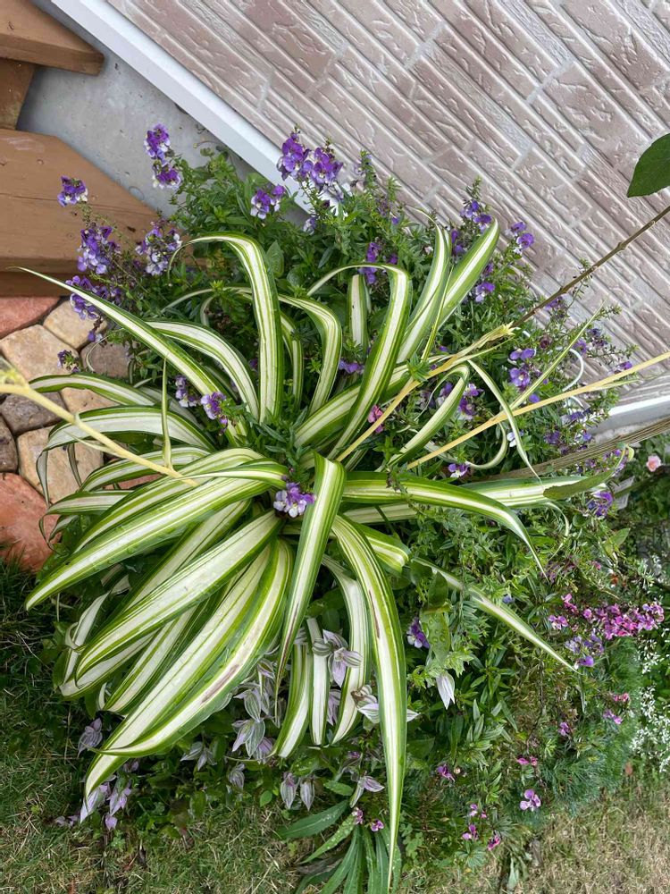 寄せ植えの中に、増えたオリヅルランの子株をちょこんと入れてたら、半年くらいでこんなに成長しています😆