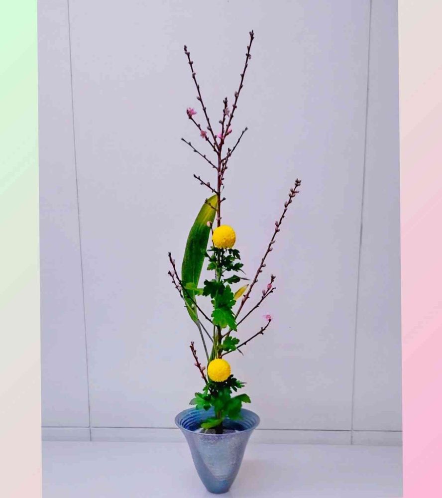 桃の花と菜の花とアイリスは 相性が良いので 組み合わせてある事が多いです