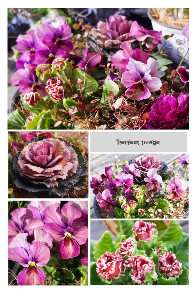 葉牡丹の萌花ビター、バラ咲きジュリアンのショコラ、なごみももかしんしん、斑入りワイヤープランツ スポットライトを使った寄せ植えです。