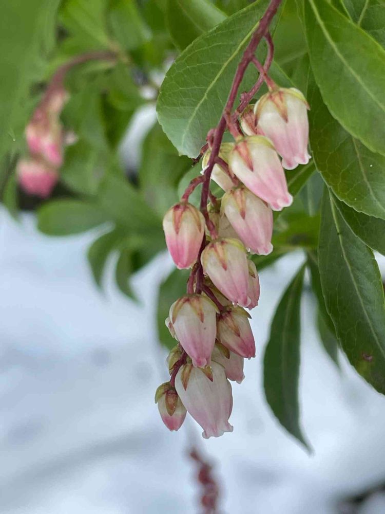 真っ白な雪❄️の中で馬酔木が咲いてます