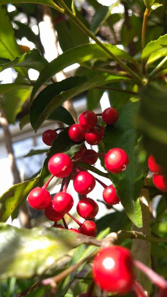 わあ、万両の実が真っ赤で綺麗ですね。鳥さん、気ずくでしょうか?