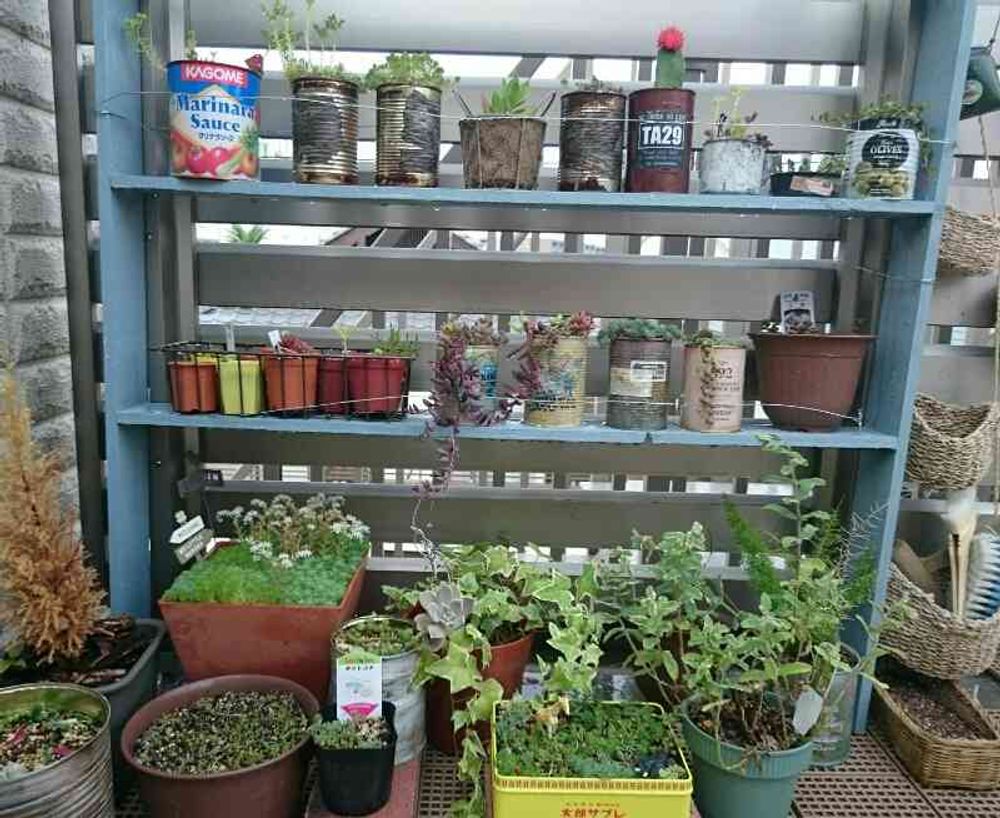 とってもかわいいベランダですね♡ほかの画像も見ました!リメイク缶とか白い板とか私の好みです♡