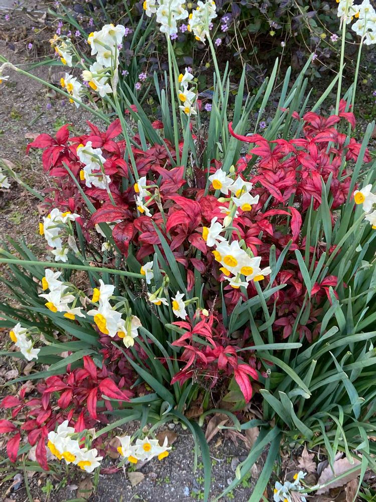 お出かけ先,南天と水仙のコラボ,コロナの早い終息を!!の投稿画像