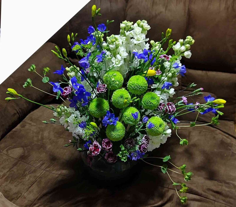 ピンポンマム💚が見えない💦のでブーケからアレンジメントに変更しました(๑>•̀๑)