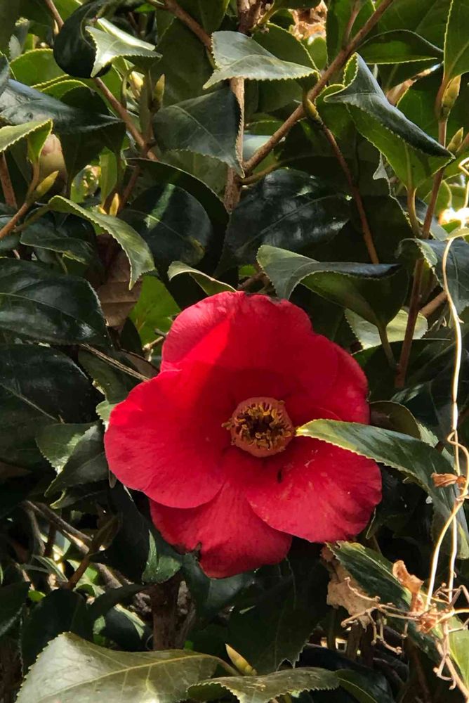 廃墟になった敷地の、門の脇で咲いていました。良く見ると、何本か椿の木があるので、散歩の楽しみが、増えました。