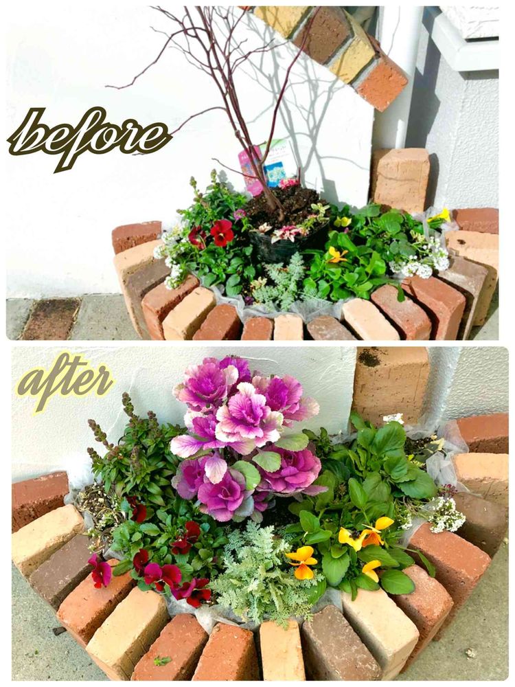 レンガ置いてるだけなので一年草の方がいいかもと変更 真ん中に底の空いた鉢で、カサ増し背の高い葉牡丹と、少し小さめの葉牡丹2種類でボリューム出してみました。
