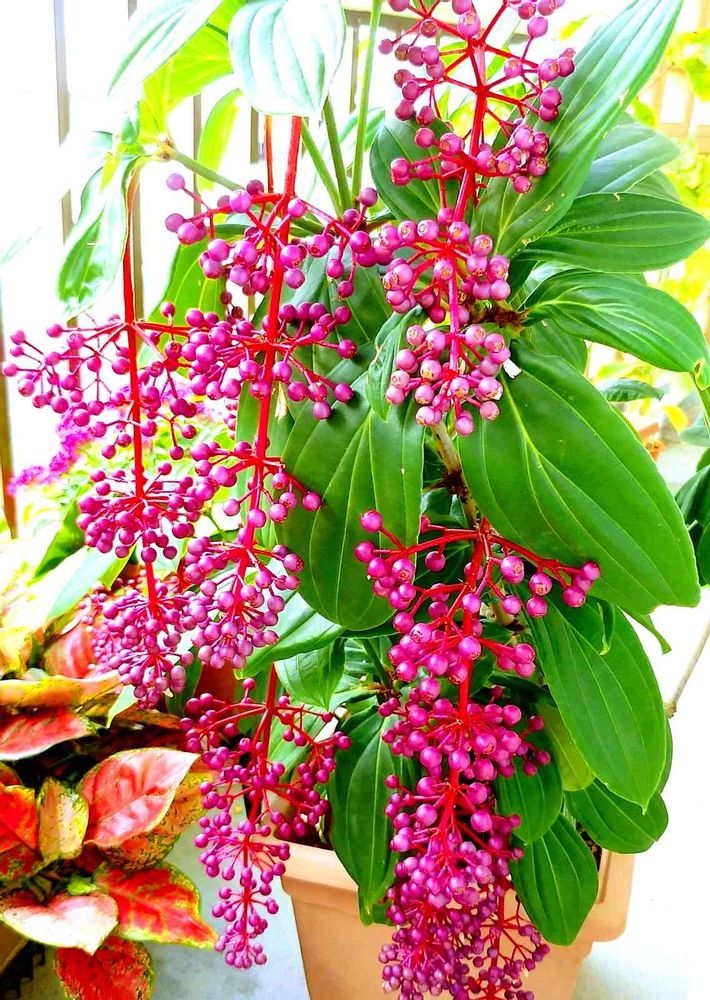 ベランダのメディニラさん!フッサフサの葡萄状態になりましたー!💗💗💗もう少しすると濃い紫の色に変わり、ポロポロ落下します💜💜後もう少し楽しめるかなー?