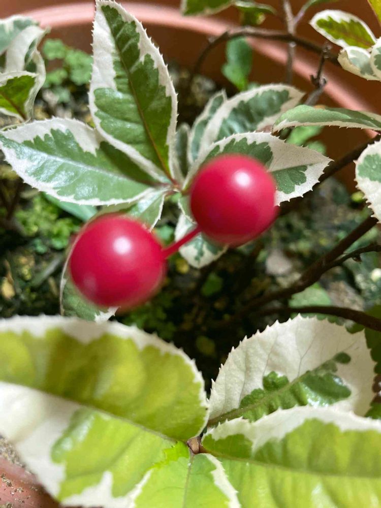 令和4年2月13日(日) 曇り☁️ おはよー^_^ございます 小さい庭の朝の見廻りしています。 班入りヤブコウジ 🪴赤い実はプラスチックの作り物😁 新しい葉の班は白く✨キレイ
