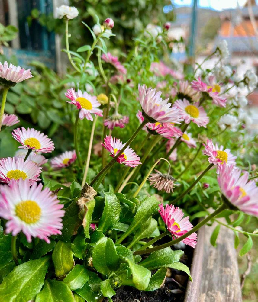 🍃出掛けた先の入り口の窓部に咲いていた雛菊たち、陽を浴びようと茎をすっと伸ばす姿が愛らしく希望に満ちています✨