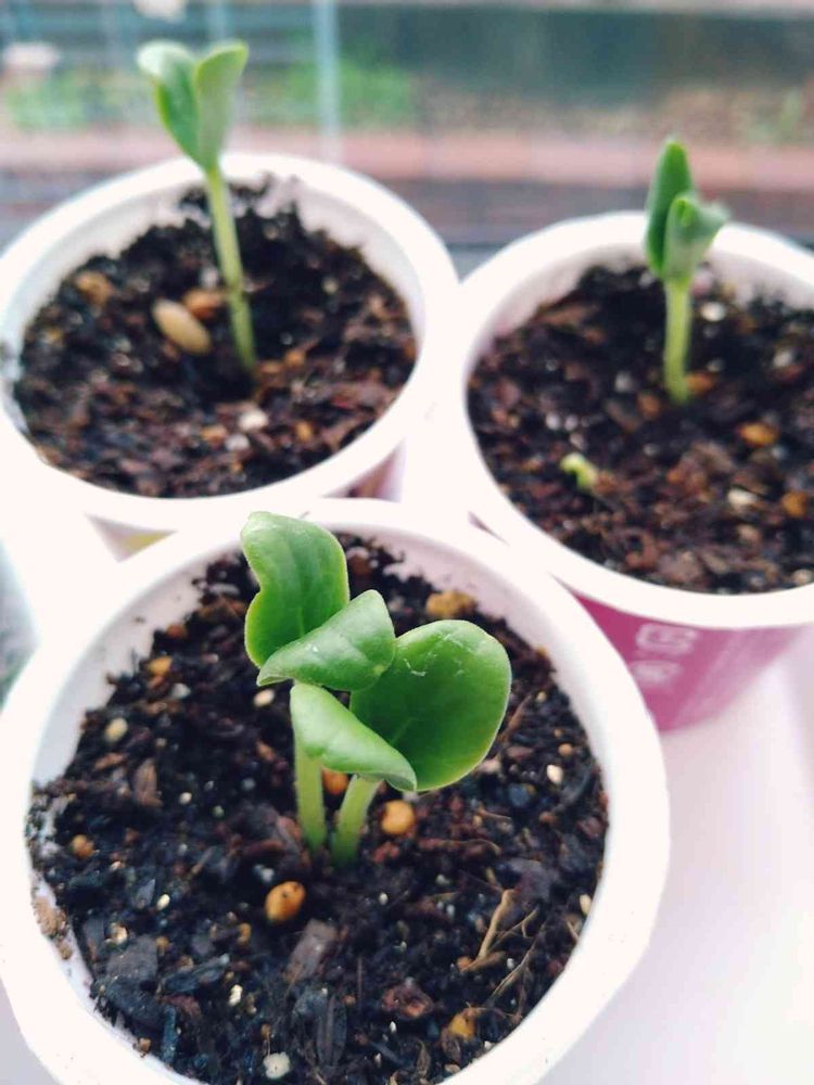 昨年夏に食べた「山形産 鶴姫 レッドメロン」から採取した種を窓辺でヨーグルトカップに2粒ずつまきました🍈