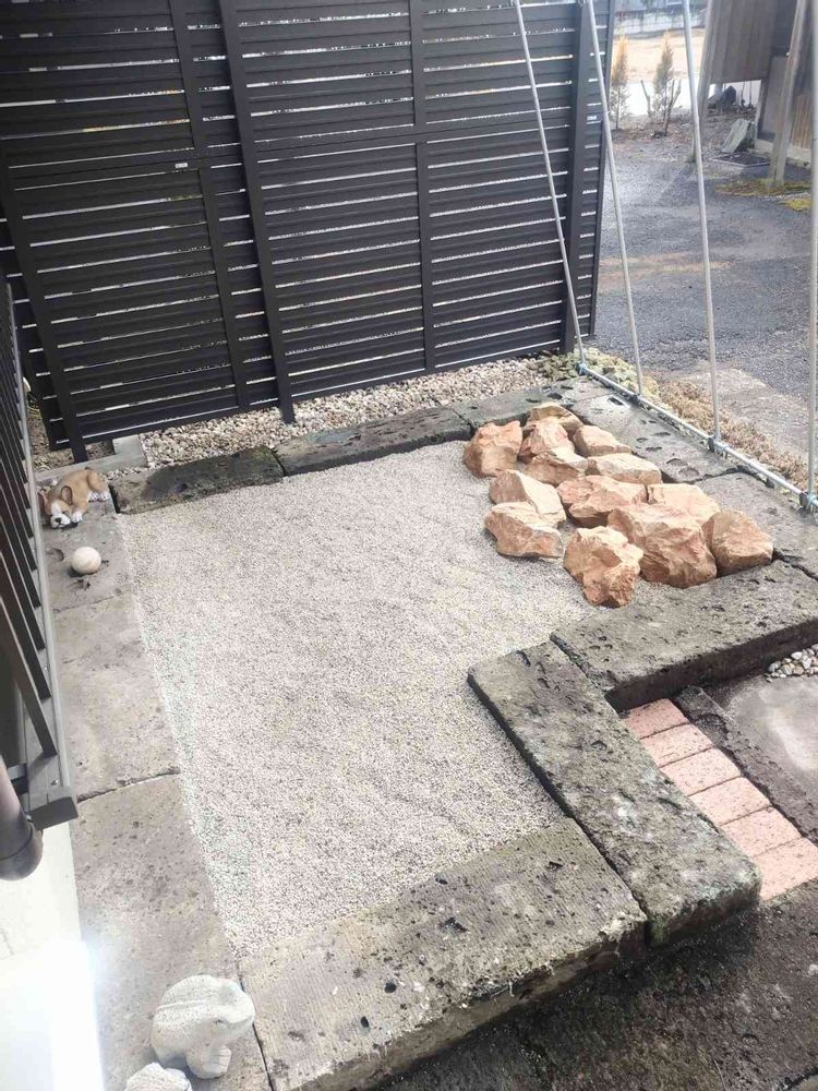 最初は左半分の長方形だったけど、増築して、こんな形になりました😅並べる石も用意して、後はアガベを植えるだけです😀