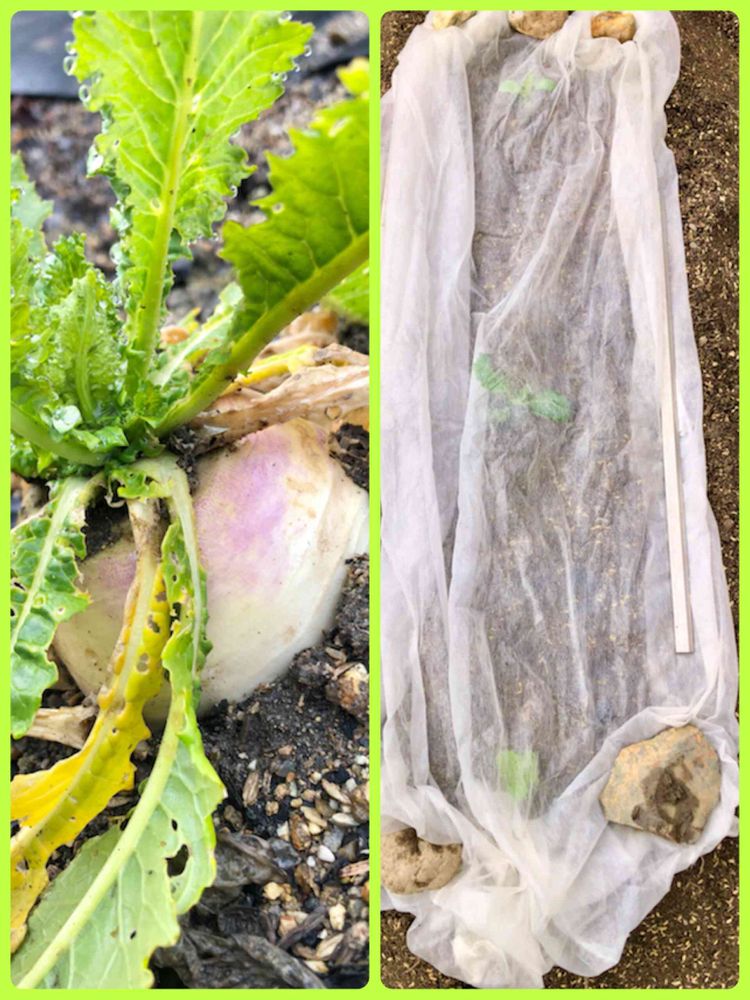 朝収穫。そのコーナー、腐葉土・ボカシ肥・石灰入れ耕し