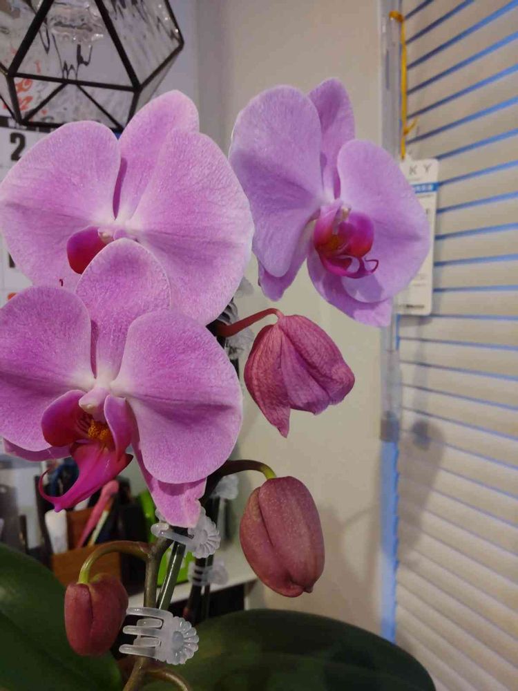 3輪開花。4つ目はダメだな⤵️⤵️蕾が膨らんできた時にクリップに当たっていて😓クリップを移動したけど花茎に影響下があったみたいで萎れてきた😩