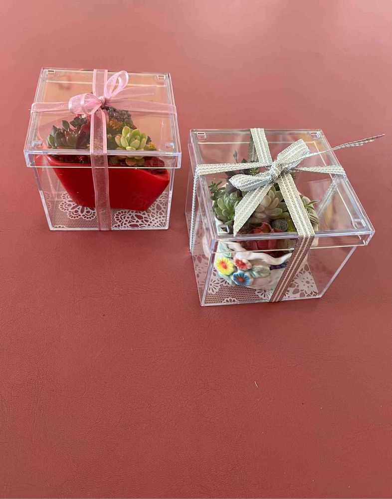可愛い器に入れた可愛いぃ手作り多肉さんの寄せ植えを二つ作って可愛いくラッピングしたのね!