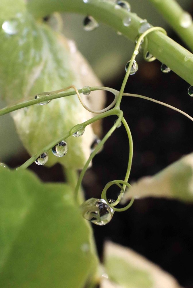 今日は今年3度目の雪。前回ほどは積もらなかったけど、庭は全面白くなっていました。ベランダにあるスナップエンドウのプランターにも雪がかかって、つるや茎に溶けた雪が水玉を作っていました。