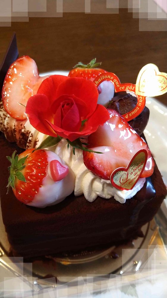 🍰直径15cm位のキューブ型のチョコレートケーキでしたが、イチゴ・薔薇の赤色とチョコ色のコントラストがメチャクチャ素敵でした~✨✨✨