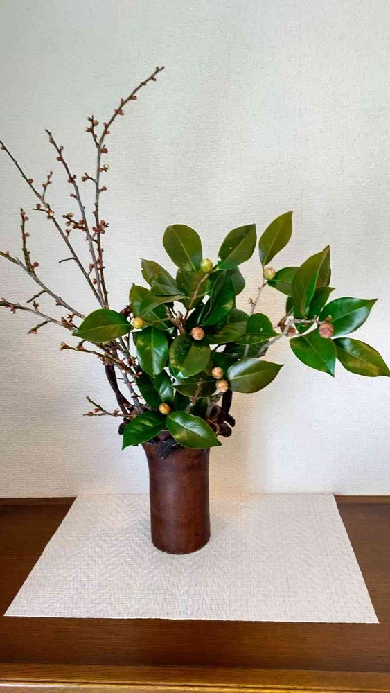 椿も寒梅もまだ蕾ですが…お値打ち品だったので買ってきました。合いそうな花器がこれしかなくこの花器に投げ入れにいけてみました。渋い〜和風花やっぱり素敵ですね✌️🥰✌️