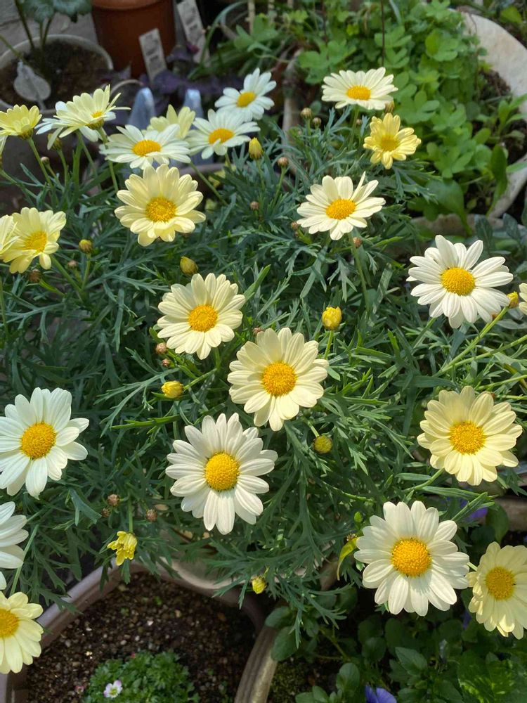 ☘️マーガレット[エンジェリックシリーズ]☘️.....優しい薄黄色で和むわぁ😆なるほど分枝性が良いのね。1/22upの時に比べたら横に綺麗に広がってきてくれてるよ✨🌼💕🌼💕✨