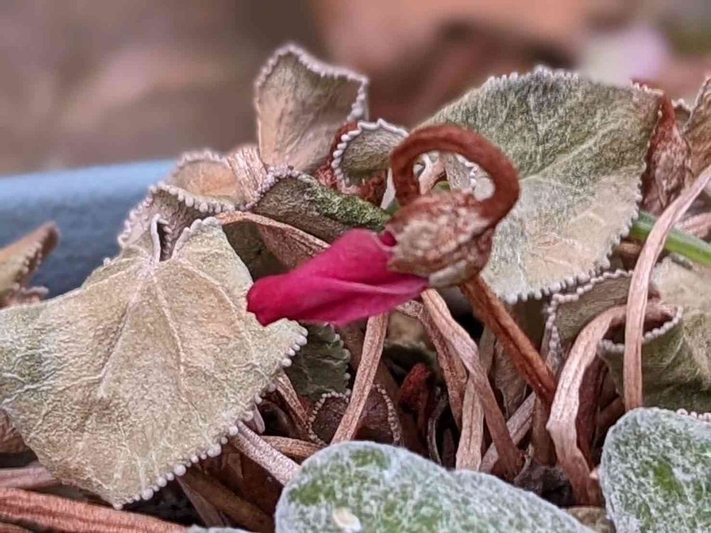 寄植えの中のガーデンシクラメン…ビオラとともに早くも凍みてしまって、もう駄目かと思っていましたが、昨日朝復活していました。…ビオラも大丈夫かな?の感触です。
