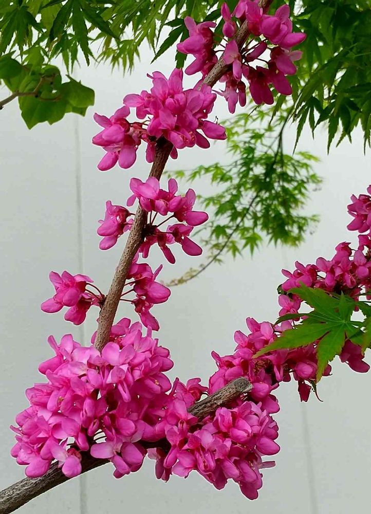 濃いピンク色のハナズオウがモミジの葉っぱ🌿で引き立ちますね。