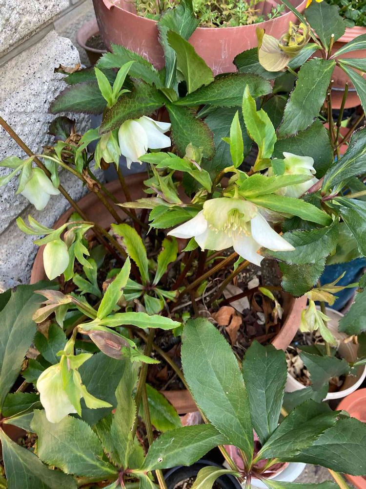 三年前友達からもらった白花クリスマスローズのつぼみがいっぱい咲いてます。今年はどんだけ咲いてくれるのかしら。