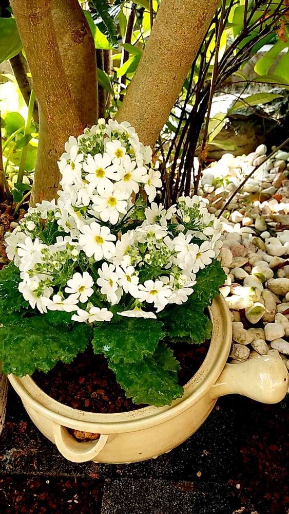 白のプリムラマラコイデス、急須に入って可愛い😊