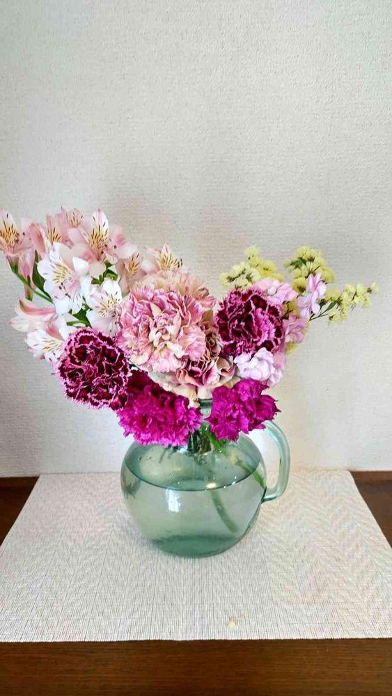 このお花はしばらく前に買ったカーネーションをいけてみたのですがまとまりがよくなかったのでアルストロメリアとスターチスを入れて写メしました。