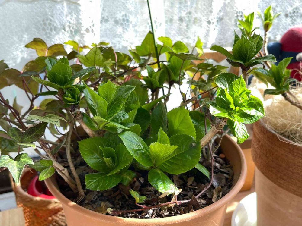 外で凍結していたスクロールハイドランジアを出窓に移動して約一ヶ月。