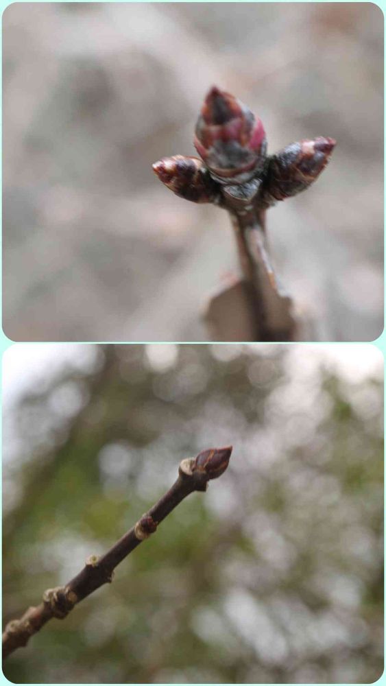 冬芽も、気持ちプックリしてきてるような気がします。気のせいかナ。春が待ちどおしいからかナ。今朝、雪が積もってしまった。