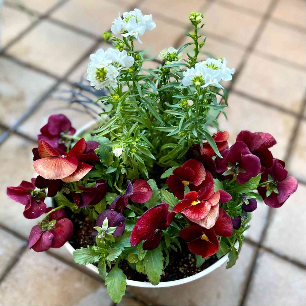 素敵な色合いのパンジー?ビオラ?どっちですか❓どっちにしても、種から育ててこんなにモリモリ‼️すごいです👍✨白いリナリアとバッチリあってて大人な寄せ植えですね🥰❣️素敵‼️