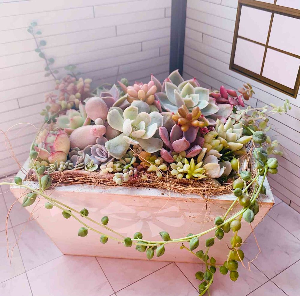白っぽいナチュラルな感じなので、優しい色の多肉ちゃんで寄せてみました😊