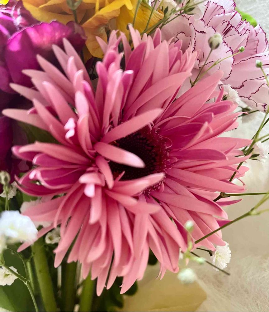 このガーベラ、花びらが変わってますねー!色も可愛い💕