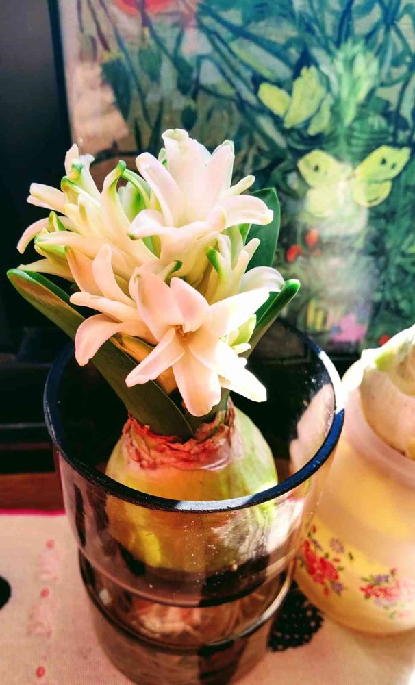 白いヒヤシンスが、少し咲きだして〜香りが、少し違うような💙🤍💙
