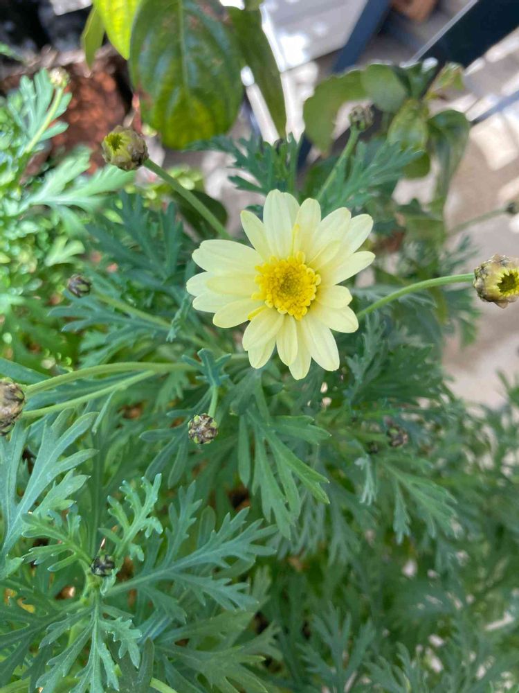 一年先輩のボンザマーガレットと同じ鉢に同居植えして先輩に覆い被されそうになっていますが、先輩より一足早く咲いてアピールしているかの様です